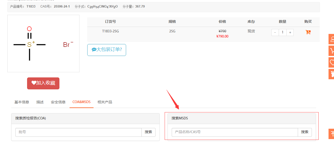 第1步:進入產品詳情頁面,點擊圖片下方COA&MSDS,進入查詢頁面: